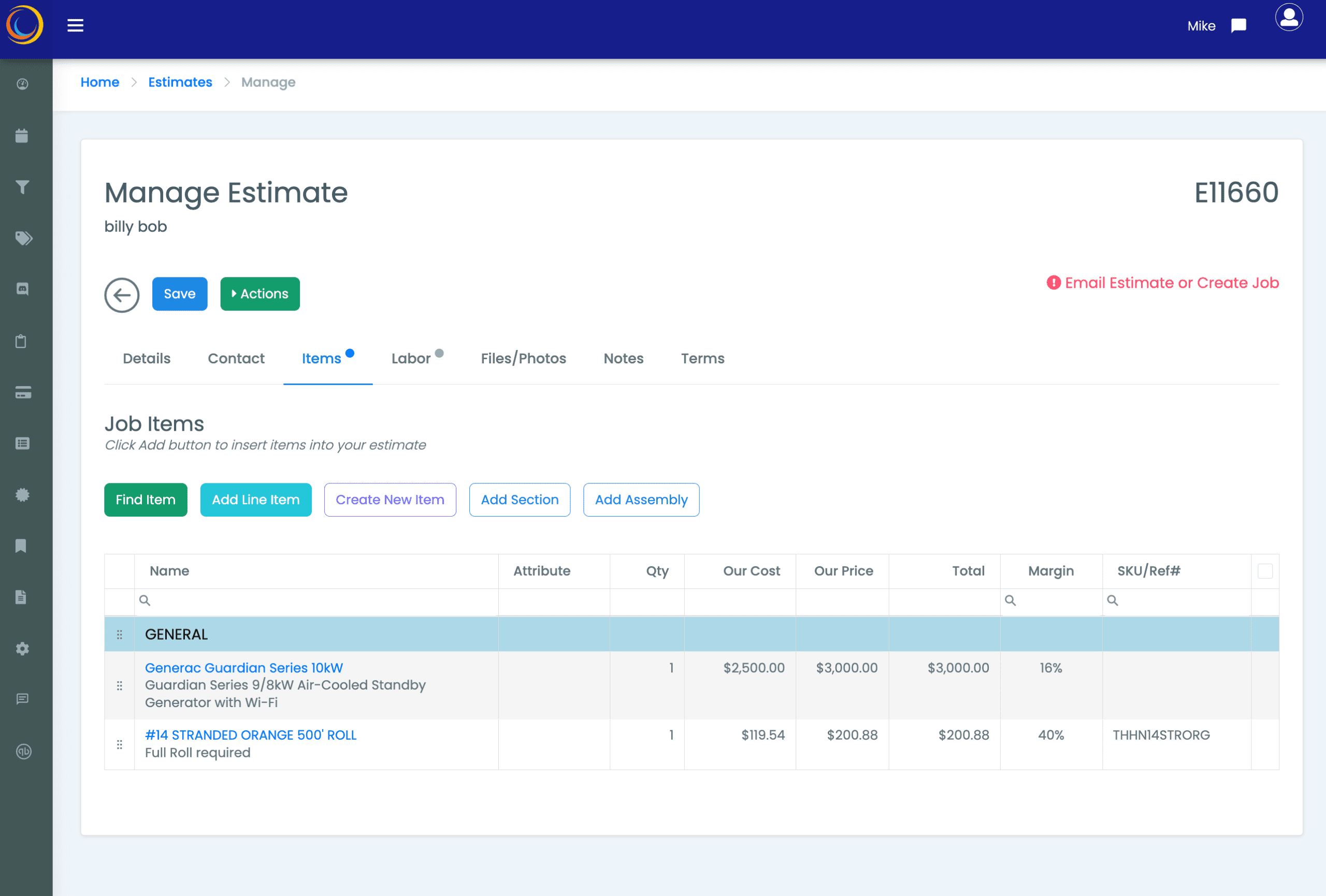 - From the Items tab on the estimate, start adding items