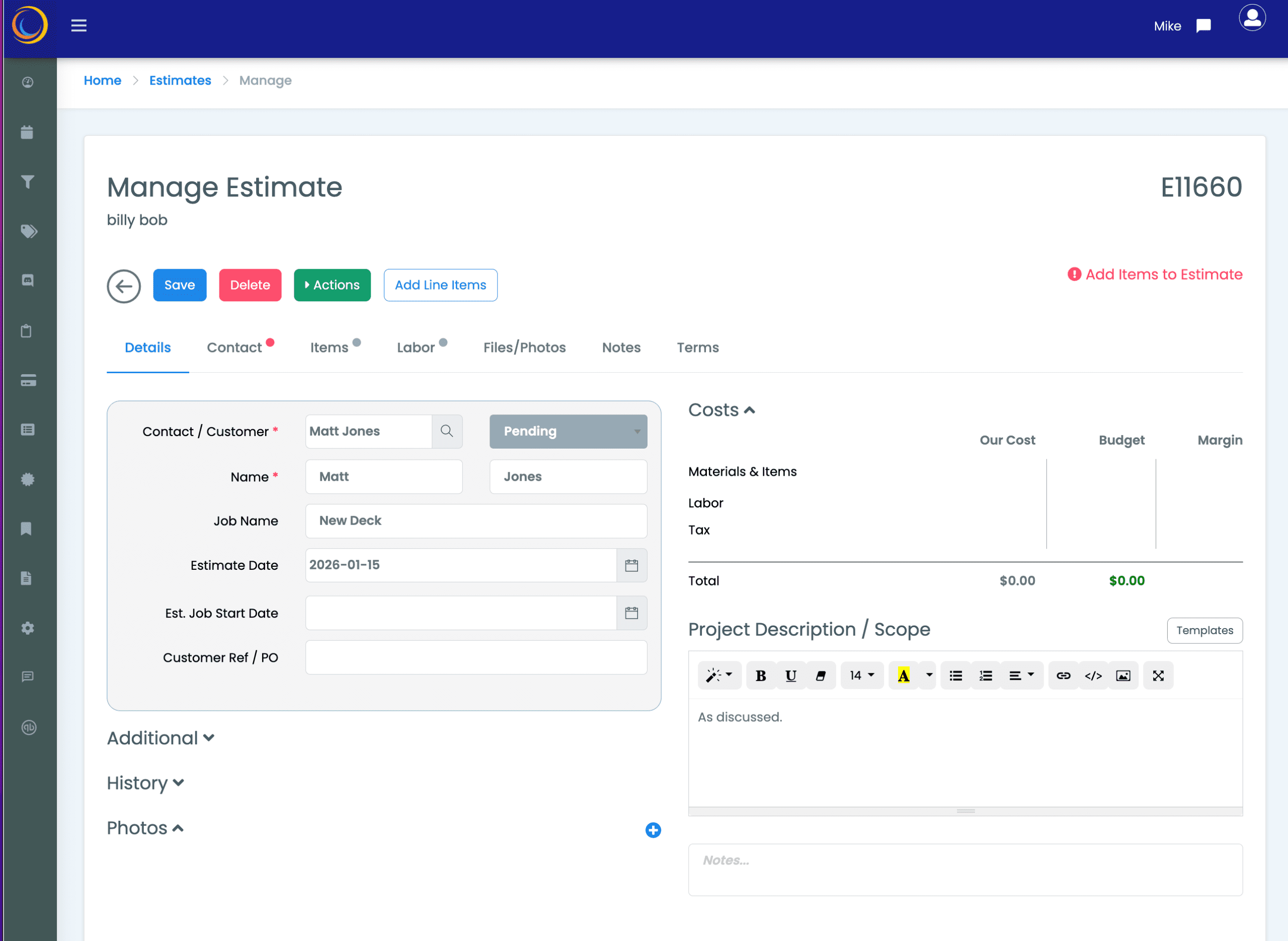 - A Quick Estimate lets you send out a simple estimate in hurry. Great for those small jobs.